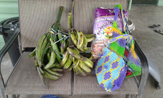 brought garden food of bananas, taros and greens with coconuts and string bags